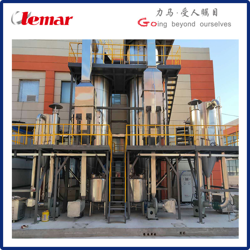 常州力馬干燥工程有限公司在利用噴霧干燥機(jī)對(duì)固含量50%左右的甜菊糖甙料液進(jìn)行干燥時(shí),積累了豐富的經(jīng)驗(yàn)。針對(duì)甜菊糖甙終產(chǎn)品的特點(diǎn),機(jī)組的收料系統(tǒng)采用了獨(dú)特的冷凍除濕冷風(fēng)冷卻收料裝置,既保證物料瞬間離開高溫區(qū)域避免物料軟化而得到冷卻,又可避免物料在濕度較高的環(huán)境下吸濕等現(xiàn)象。