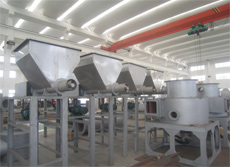 熱空氣由主機底部進風口切向進入閃蒸干燥機主塔、在閃蒸干燥機主塔內(nèi)形成螺旋形的上升高速旋轉(zhuǎn)氣流,同時根據(jù)不同的物料性質(zhì)調(diào)整底部環(huán)隙大小,使風速處于合適的狀態(tài)。物料經(jīng)螺旋加料器直接進入閃蒸干燥塔,在高速氣流的沖擊和帶動下,迅速分散并隨氣流作高速旋轉(zhuǎn)運動。對于比較大且潮濕的顆粒團,高速氣流不足以使之破碎并高速旋轉(zhuǎn),于是在重力作用下逐漸下落,當落到主機底部時被設(shè)置在底部的破碎裝置強行破碎并微?;缓箅S高速氣流一并旋轉(zhuǎn)上升而完成干燥過程。為了使物料的終水分達到極低同時不受初水分的波動而影響產(chǎn)品質(zhì)量,在干燥塔內(nèi)設(shè)置多層旋流片,形成較為穩(wěn)定的流態(tài)化床,同時旋流片亦起到保證干燥所必須的停留時間和分級的作用。
