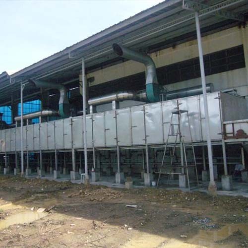 將所要處理的物料通過適當?shù)募恿蠙C構(gòu)(如星型布料器、擺動帶、粉碎機或造粒機),分布在輸送帶上,輸送帶通過一個或幾個加熱單元組成的通道,每個加熱單元均配有空氣加熱和循環(huán)系統(tǒng),每一個通道有一個或幾個排濕系統(tǒng),在輸送帶通過時,熱空氣從上往下或從下往上通過輸送帶上的物料,從而使物料能均勻干燥。