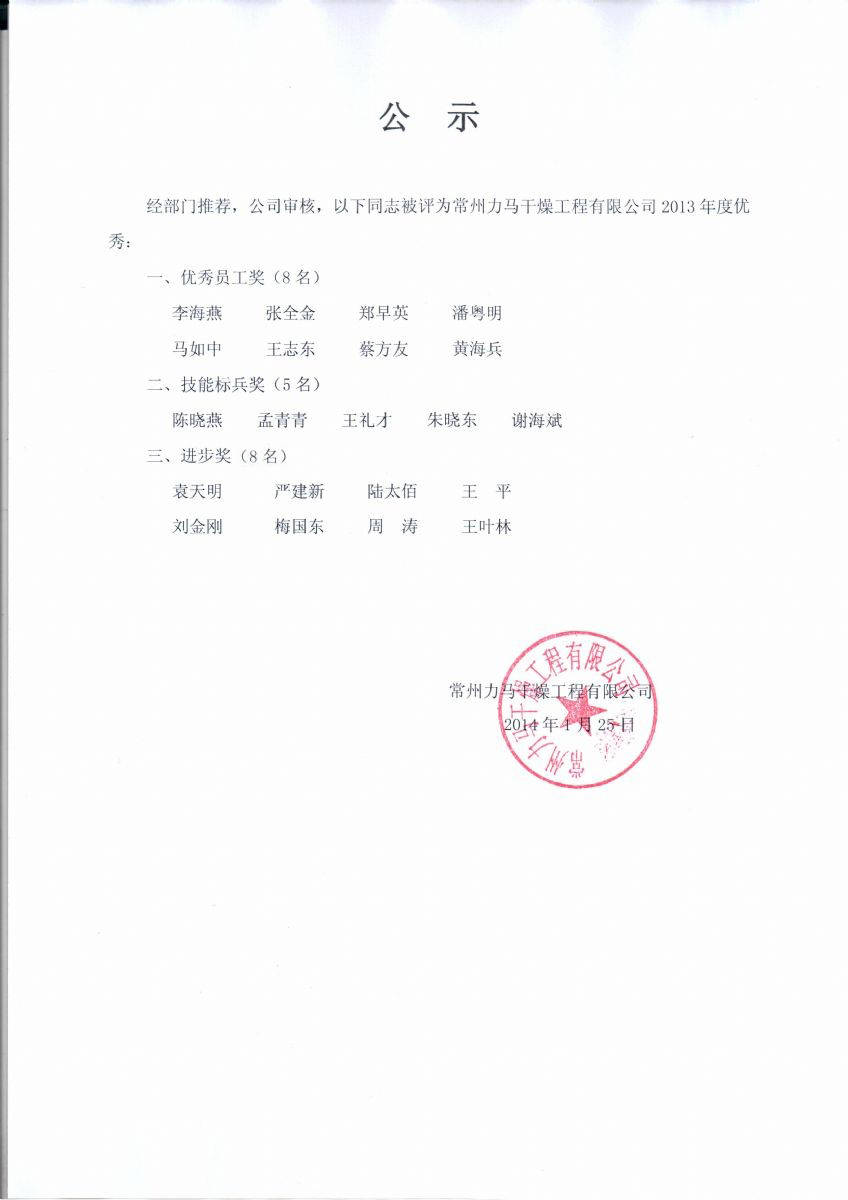 經(jīng)部門推薦,公司審核,以下同志被評(píng)為常州力馬干燥工程有限公司2013年度優(yōu)秀: