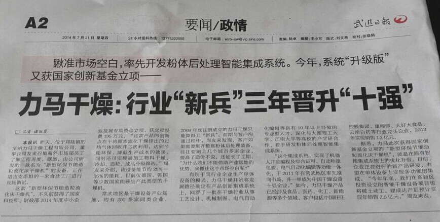 經(jīng)常州市武進區(qū)科技局舉薦,在2013-2014年度科技創(chuàng)新工作中成績突出的常州力馬干燥工程有限公司,其企業(yè)創(chuàng)新精神,值得由地方官媒向全市全區(qū)進行報道,敦囑轄區(qū)各個高新技術(shù)企業(yè)持續(xù)走科技興企之路。