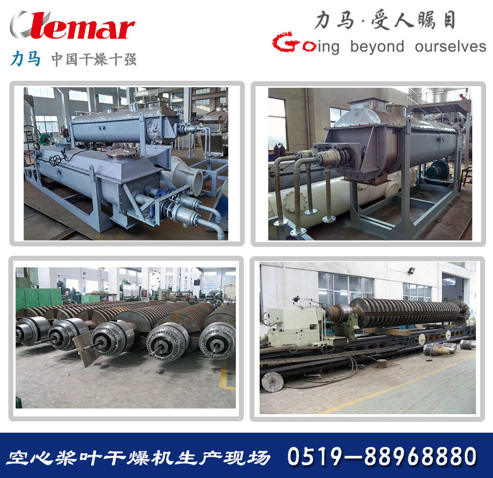 此次臺塑集團向常州力馬訂購的通軸式空心槳葉干燥機主要通過熱傳導來實現(xiàn)干燥功能,它的核心是兩根空心軸和焊在軸上的空心攪拌槳葉。槳葉形狀為楔形的空心半圓形,可以通入加熱介質(zhì),除了起攪拌作用外,也是設備的的傳熱體。槳葉的兩主要傳熱側面成斜面,因此當物料與斜面接觸時,隨著葉片的旋轉,顆粒很快就從斜面滑開,使傳熱表面不斷更新,強化了傳熱效果。在槳葉的三角形底部設有刮板,以將沉積于殼底的物料刮起,防止產(chǎn)生死角。在進料區(qū)、干燥區(qū)、排料區(qū)除槳葉外,另設有輔助機構,以保證整機操作穩(wěn)定,干燥均勻。